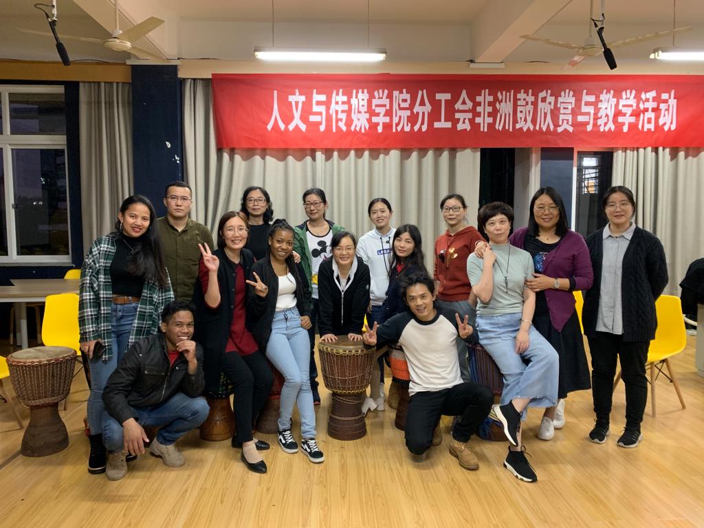 来自马达加斯加的三位留学生也来参与助兴,一场非洲鼓的欣赏与教学活动让老师们在笑声和鼓声里舒缓了疲惫、放松了精神,在笑声与鼓声中好像做了一场精神spa。同时,本活动也增强了师生感情,加强了国际间的文化交流。