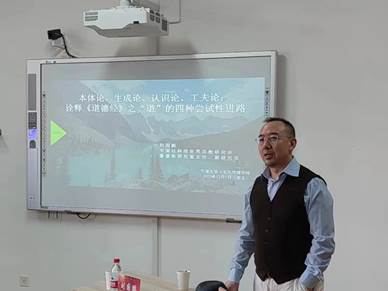 接着刘老师以《道德经》第25章为例阐释了“道”的本体论进路。并举《道德经》第25章为例:“有物混成,先天地生。寂兮寥兮,独立而不改.......吾不知其名,字之曰道,强为之名曰:大......人法地,地法天,天法道,道法自然。”首先需要明确的概念是,“有物混成”之“物”作为本章下文“道”的代称,系先天地而生的先天性、整体性、现成性(“混成”)之“物”,不能被对象化,并且处于不断地周期性运动和生成之中。“有物混成”之“物”不仅在时间上先于天地而生,而且是天地的来源。而这“物”,不知如何命名,其“字”称之为“道”,即在理性的、哲学的、带有价值评判的意味上称之为“道”,勉强称呼其“名”为“大”,而之所以将其称之为“大”,是因为此“物”之不可定义、不可规定,不仅指在空间、体量、规模上的“大”,且是逻辑和语言都无法衡量的“大”。本章而言的“法”不能望文生义地按照现代汉语的习惯解释为“效法”,否则,“道法自然”就将被解释为:道“效法”自然,似乎“道”之上别有一更高的存在——“自然”,而这是荒谬的,却在学术界人云亦云;本章之“法”,应当按照古汉语的习惯解释为“以之为法”,这样一来,不仅四个“法”在语用上保持了一贯性,也恰当地处理了“道”与自然的关系,即“自然”为“道”之特征,强调“道”自身便是自身的规定。