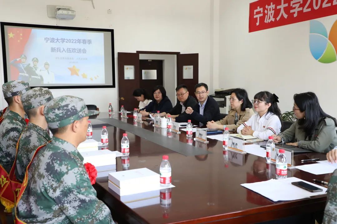 2022年春季新兵入伍欢送会在黄庆苗楼406会议室举办,校党委副书记童晓晖、校人民武装部负责人、相关学院副书记,征兵工作辅导员,军辉战友团老兵代表以及8名应征入伍学生参加。