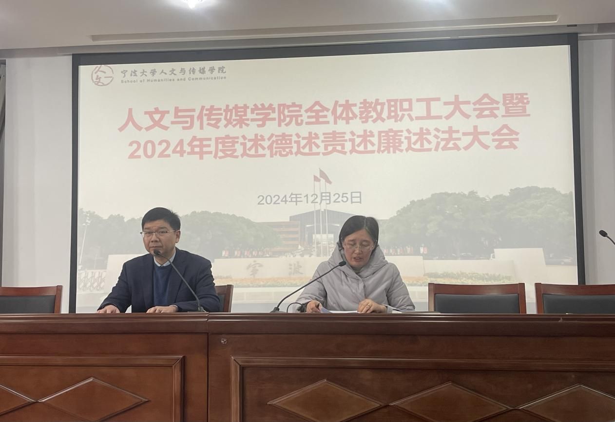 12月25日,人文与传媒学院2024年度述德述责述廉述法大会在包书书科学楼10号楼209报告厅举行。会议由院党委书记张佩芬主持,院党政班子成员及全体教职工参会。 会议伊始,执行院长李乐代表领导班子汇报了2024年度学院工作,介绍了麻豆av 党建工作、教学工作、科研工作、学生工作、国际交流及继续教育与培训等方面取得的成果,同时指出了学院工作中存在的问题及下一步举措。 随后,李乐院长与张佩芬书记分别在会上作了述德述责述廉述法报告,学院领导班子其他成员的述德述责述廉述法报告则将在干部考核系统中公布。