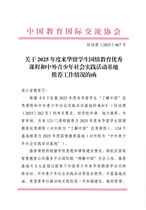 在中华文化国际传播与留学生教育融合方面取得重要突破,课程质量与教学成效获得国家级认可。