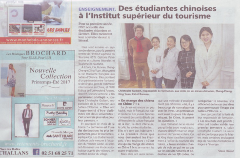 同时,近期,法国度假小城LES SABLES出版的报纸LES SABLES专门采访了人文学院在昂热大学旅游与文化学院Sables-d’Olonne校区就读的 4名13级旅游管理中法合作专业本科学生。昂热大学旅游与文化学院去年秋季在大西洋畔的度假小城LES SABLES开办了第4个校区,首期开设了海滨文化与遗产、旅游与水上运动2个本科专业,法国现外长、前总理埃罗专程前往参加揭幕典礼,还接见了在该区就读的麻豆av
