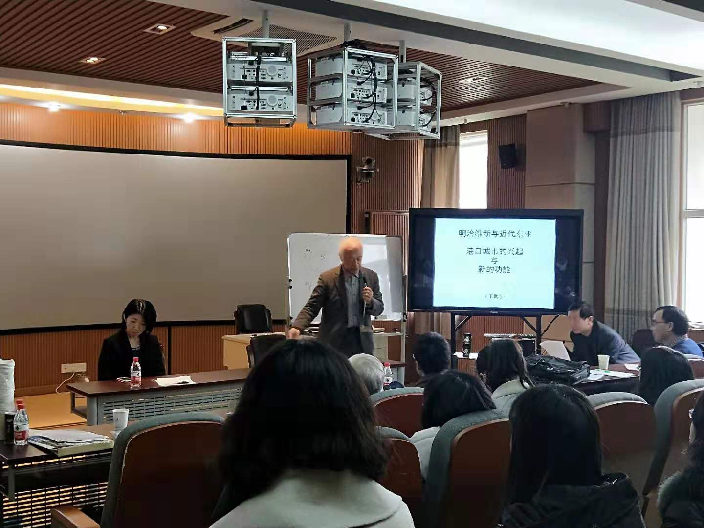 。在人文学院104报告厅,滨下武志教授与粟仓大辅博士分别为全校师生做题为“明治维新与亚洲近代历史“、“清水港的茶叶出口”的讲座。间中,楠真季子女士对日本静冈县与宁波历史上的交流做了简要介绍。报告会上,历史系刘恒武教授全程同声翻译。人文学院特聘院长龚缨晏教授主持讲座,我校包玉刚讲席教授虞和平先生,历史系主任童杰副教授、外国语学院李广智副教授等师生60余人聆听讲座。