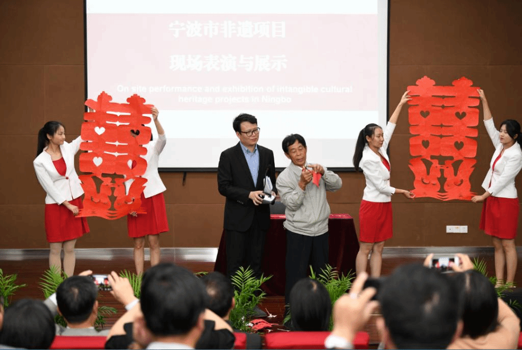 另外,象山县渔文化体验基地、北仑梅山舞狮文化实践基地和奉化区布龙文化实践基地的发言人为大家现场介绍了基地概况,展示了各项成果,在场的中外学生们听得津津有味。大会的最后,宁波市优秀非遗项目传承人还为大家进行现场表演,有沈海迪团队表演的梅山舞狮,马宝春团队带来的大头和尚,还有剪纸大师谢才华和口技大师张康夫带来的精彩表演,现场掌声不断。在民乐队欢快的锣鼓声中,大会气氛达到了高潮。不少留学生会后表示,非遗表演让人大开眼界,他们非常期待今后将有机会去亲身体验中国民俗文化。