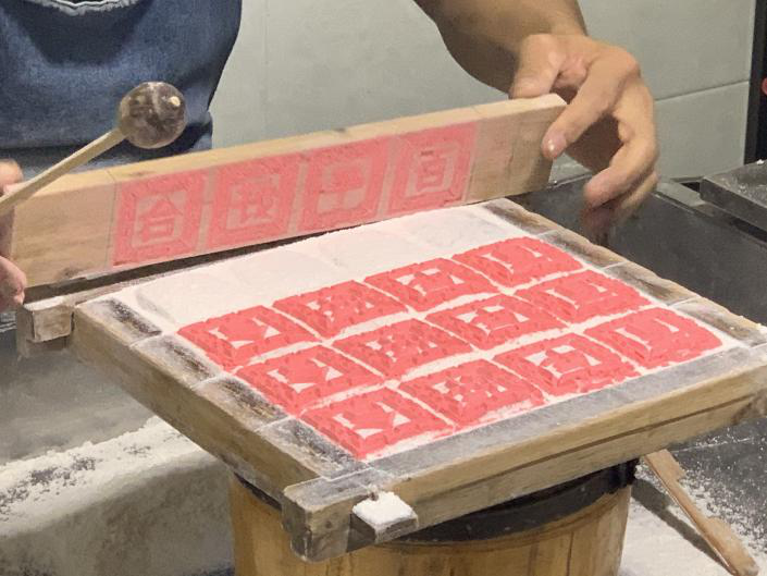 大糕制作过程,主要由师傅与其弟子带领,体验者先从筛粉开始,到最后的切糕,上蒸笼,每一步都有梅师傅的耐心教导,在学生做失败的情况之下,梅师傅也可以“妙手回春”,将失败品补救回来。一方小小糕点,内有乾坤,起初的雕空部分,很多同学表示太难了,不是雕深了,就是雕浅了,在师傅的耐心指导下,大家总算有模有样完成糕点的雏形。