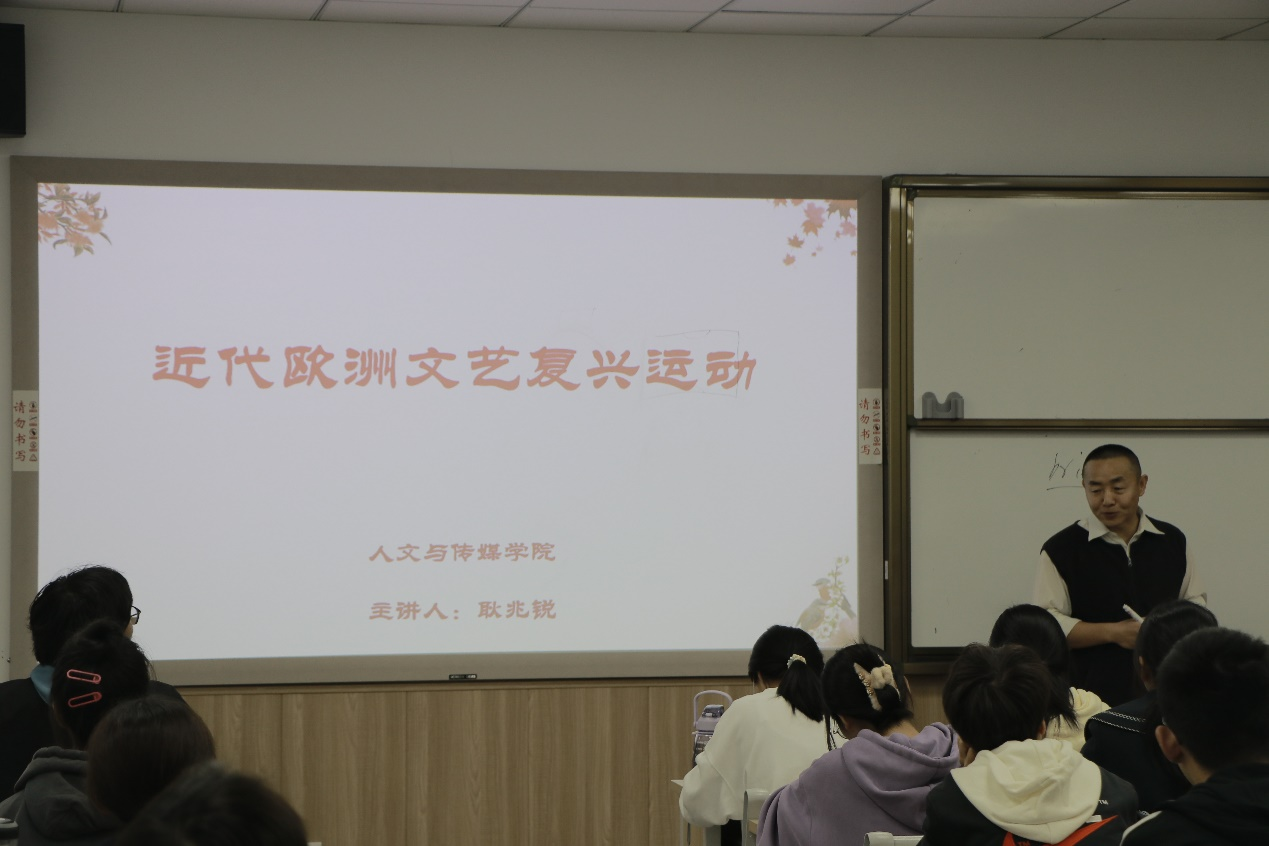 推荐耿兆锐老师的《世界文明简史》课程,顺利在北区2号教学楼407教室开讲。本次课程主要讲授“近代欧洲文艺复兴运动”,以革命导师恩格斯的名言导入课程,带领学生感受文艺复兴的绮丽多姿。