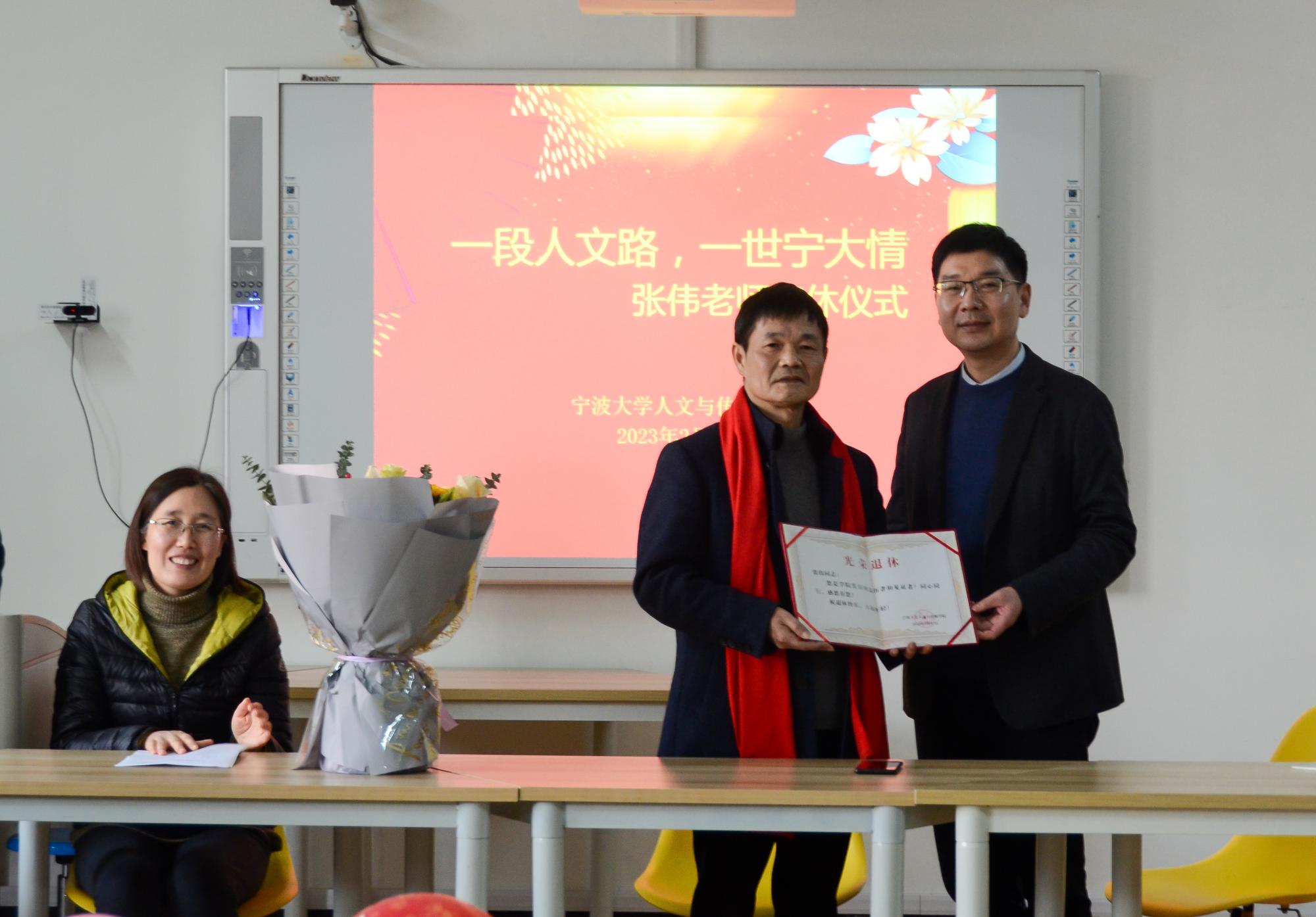 仪式上,李乐院长为张伟老师颁发荣休证书,并送上鲜花和祝福。他表示,张老师是学院发展的亲历者和见证者,同心同行,感恩有他!鲜花和祝福承载着学院尊师重道的精神传承和饮水思源的情感传递,也承载着全院师生对荣休教师的依依惜别与百般不舍。