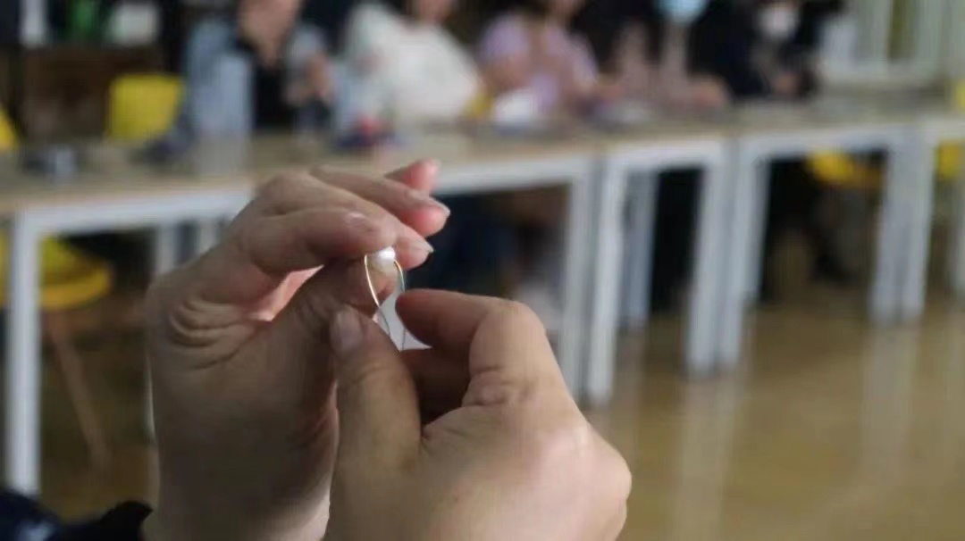 簪花老师早早地来了,给每一位参与活动的老师同学配备了制作工具。看着簪花已经制成了范例,不少同学和老师就迫不及待地向簪花老师请教簪子的制作过程。待参与的师生齐齐落座,簪花老师就带领大家开始今天的手工之旅。