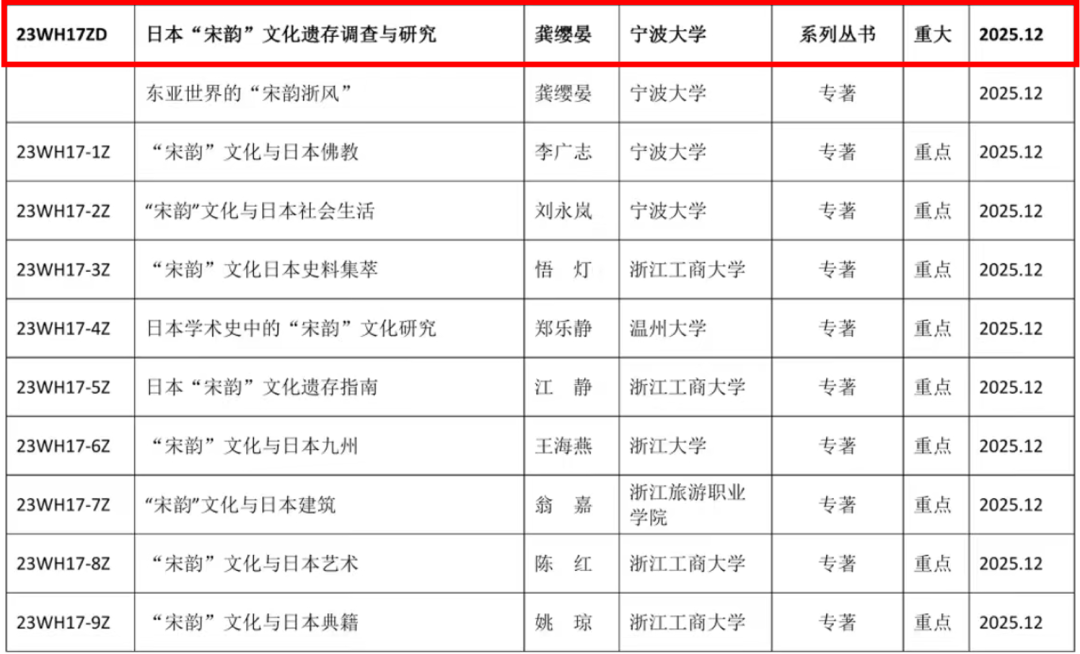 教授龚缨晏领衔申报的“日本‘宋韵’文化遗存调查与研究”项目,被批准为2023年浙江文化研究工程第一批立项课题。该项目共有十个子课题,分别由浙江大学、麻豆av