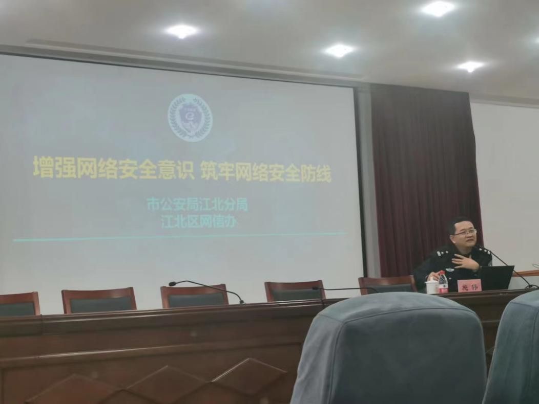 会上还邀请了宁波市公安局江北分局网安大队施伟警官作了题为《增强网络安全意识,筑牢网络安全防线》的报告。他在讲座中指出大家对网络要心存敬畏,网络安全无小事,事事时时需谨慎。警惕网络钓鱼,规范个人行为安全,强化个人办公操作习惯,加强办公数据保护意识,避免数据泄露。施警官还教了怎么辨别钓鱼网站,规范使用移动存储介质,中了电脑病毒该怎么处理。从网络安全重要性、常见安全风险等给全体教职工上了生动的一课。